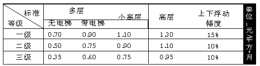 普通住宅小区收费等级按服务内容与标准的不同,划分为一级、二级、三级三个等级,各等级收费基准价及其浮动幅度详见附表一,等级标准详见附表二。