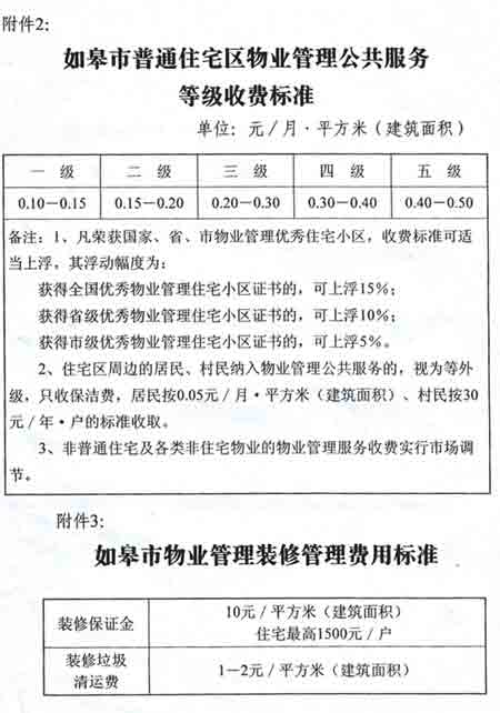 1、如皋市普通住宅区物业管理公共服务收费等级标准