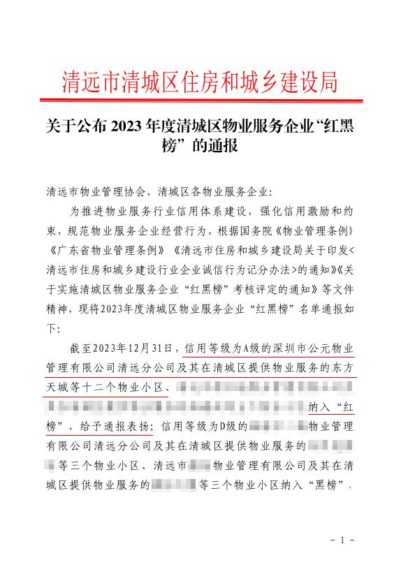 【本站讯】(肖端阳)为推进物业服务行业信用体系建设,强化信用激励和约束,规范物业服务企业经营行为,根据国务院《物业管理条例》《广东省物业管理条例》《清远市住房和城乡建设局关于印发<清远市住房和城乡建设行业企业诚信行为记分办法>的通知》《关于实施清城区物业服务企业“红黑榜”考核评定的通知》等文件精神,清远市清城区住房和城乡建设局现将2023年度清城区物业服务企业“红榜”名单公布,截至2023年12月31日,信用等级为A级的深圳市公元物业管理有限公司清远分公司及其在清城区提供物业服务的东方天城等十二个物业小区被纳入“红榜”,给予通报表扬。
